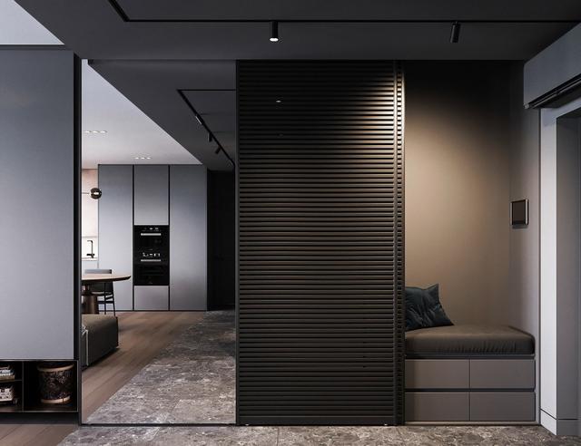 板條隔墻將客廳與入口分隔開(kāi)來(lái),讓客廳感覺(jué)舒適。同樣的效果也被用于設(shè)計(jì)隱藏存儲(chǔ)空間的門(mén)。