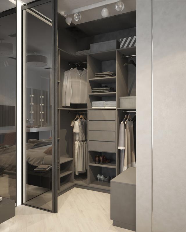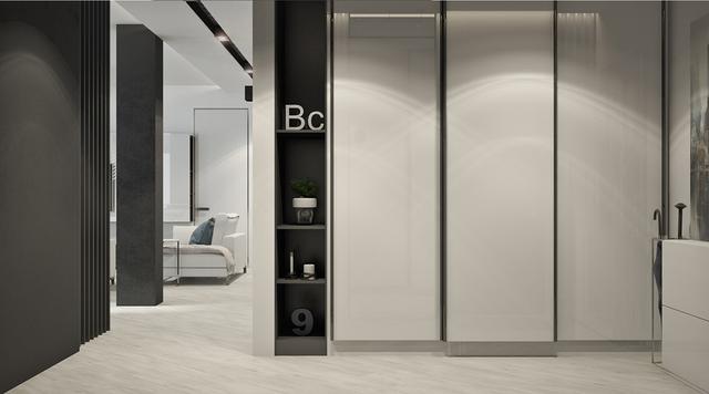 近距離觀察主臥室套房的步入式衣柜——玻璃門被拉得整整齊齊。