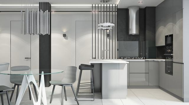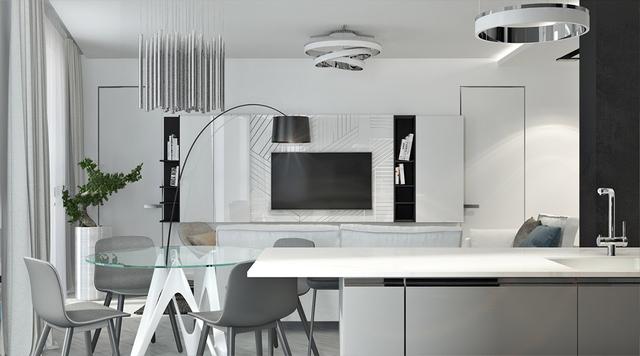 客廳、餐廳組合在自由流動空間的盡頭直接流入廚房。低垂的用餐吊燈視覺上將用餐區固定在沙發后面和早餐廚房的一側。圓形餐桌的玻璃頂部坐落在一個雕塑般的白色支撐柱上。四把簡單的灰色餐椅構成了整體。
