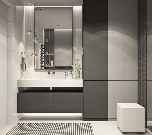 在浴室對面的墻上,一個線性的現代浴室梳妝臺與一排高灰色的浴室儲物柜相連。
