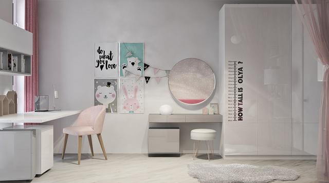 孩子臥室的另一側是亮色的白色衣柜,上面裝飾著個性化的高度圖貼紙。更多的兒童墻裝飾跨越了一個虛榮區和一個書房之間的空隙。