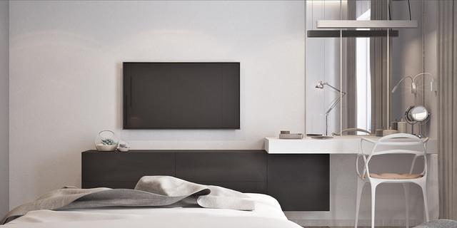 在床腳,在電視下方的墻上安裝了一個電視柜,直接運行在一個浮動的梳妝臺下面。美麗的梳妝臺好像是卡德斯·馬斯特斯的椅子風格。