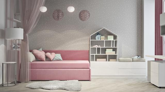 離開成人宿舍后,在這個女孩的房間里,一張粉色的兒童床與柔軟的灰色墻紙形成鮮明對比,墻紙上有白色的圓點花紋。