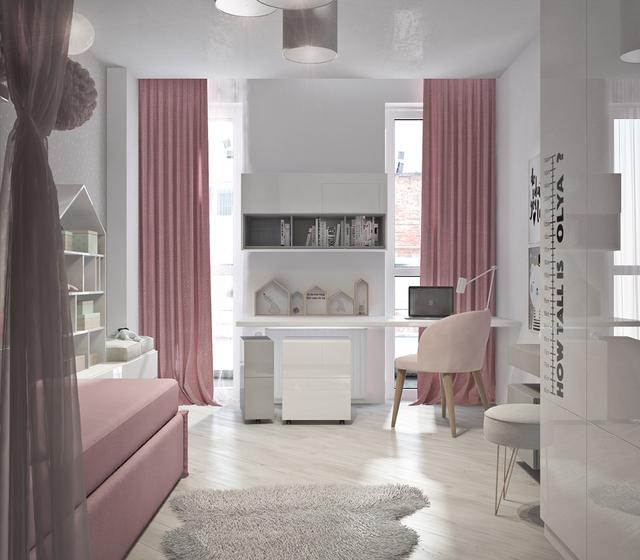 孩子的課桌旁放著一把淡粉色的椅子。木房子形狀的架子裝點著工作臺。淺粉色的窗簾懸掛在兩層樓的落地窗下。