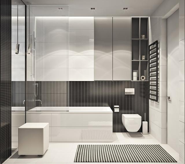黑色和白色浴室是風格硬邊緣和線性形式。一個立方體的凳子坐在一塊長長的鏡子前,前面是一個非常長方體的浴缸。一個硬邊便盆從覆蓋著黑色長方形瓷磚的墻上突出來。一條單色條紋地毯裝飾著房間。