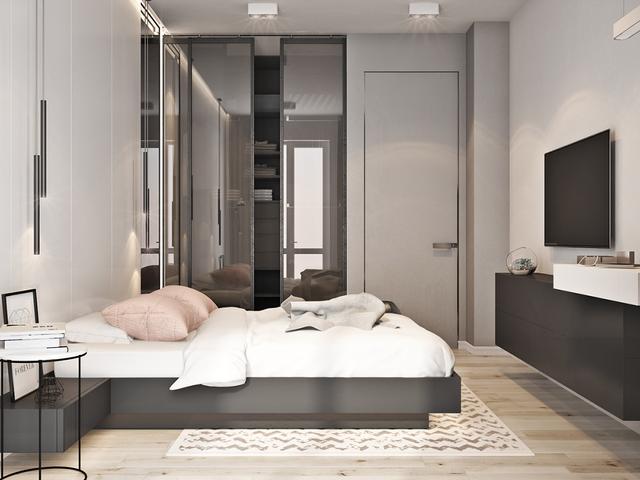 白色的人字形地毯軟化了臥室木地板的外觀。在床的另一邊,滑動玻璃門露出一個步入式衣櫥。