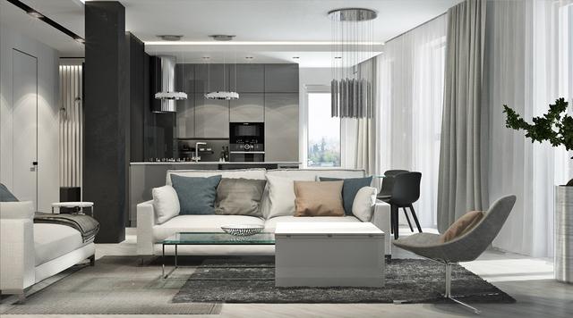 黑白相間的客廳在兩個白色沙發上點綴著淡藍色和餅干色的突出坐墊。周邊的led、嵌入式軌道照明系統和現代化的壁燈照亮了通往臥室和浴室的走道。