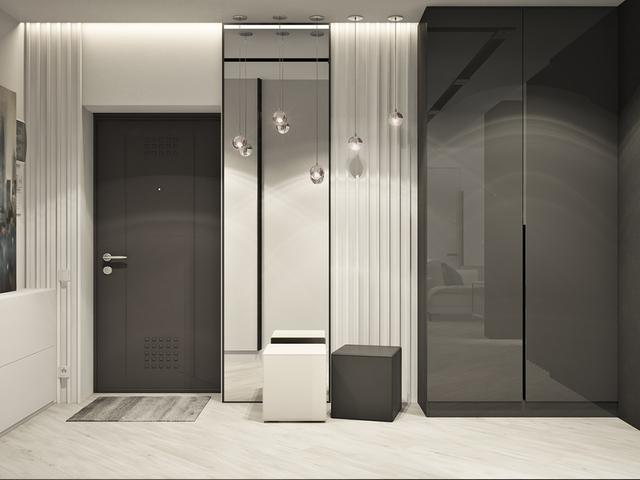一個白色光澤的鞋柜和一個現代雨傘架位于大廳的盡頭,下面是一件現代藝術品。