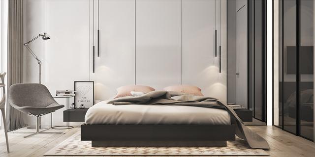 別致的臥室吊燈懸掛在漂浮的床沿上。環繞在平臺床邊緣的LED條創造了一個懸浮的錯覺。