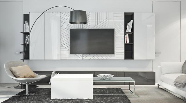 一盞黑色弧形落地燈照亮了客廳布置的中心。電視墻的裝飾創造了一個單色幾何圖案的焦點,隱藏的媒體存儲柜和展示架單元