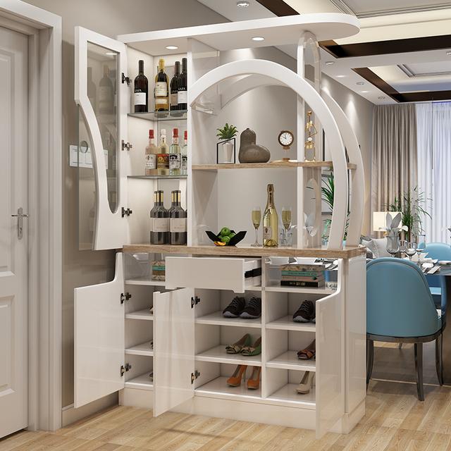 這樣的玄關設計我覺得也不錯,上面是隔板下面是鞋柜,用的是一個這樣的玄關隔斷柜,實現了玄關與餐廳的隔斷設計,搭配的柜子造型也很獨特有創意感,白色的柜子收納起來也是相當的方便。