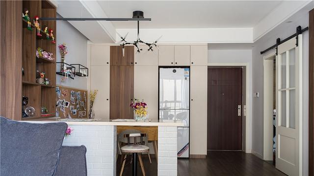 北歐風格的玄關,以這樣的方式簡單布置,也是十分不錯的想法,直接用的是隔板的鞋柜,是一種與酒柜一體式的柜子,底部可以實現鞋子的收納,上面帶有酒柜卡槽的設計,可以用來收納一些酒,也能實現與客廳的隔斷。
