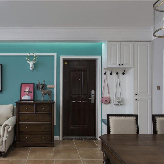 這種入戶玄關直接是沒有走廊,小戶型的玄關就可以以這樣的方式進行裝修,靠墻的一邊門口的地方,打造一體式的鞋柜和衣柜,這樣的設計方式顯得很整齊,而且也不占用玄關的空間,這邊靠沙發擺放儲物柜一樣可以實現收納。