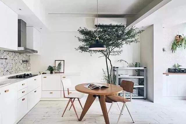 餐廳和開放式的廚房集合,櫥柜是靠著墻面設(shè)計(jì)的L型櫥柜,原木風(fēng)的餐桌椅搭配角落里的綠植和收納架,實(shí)用又美觀。