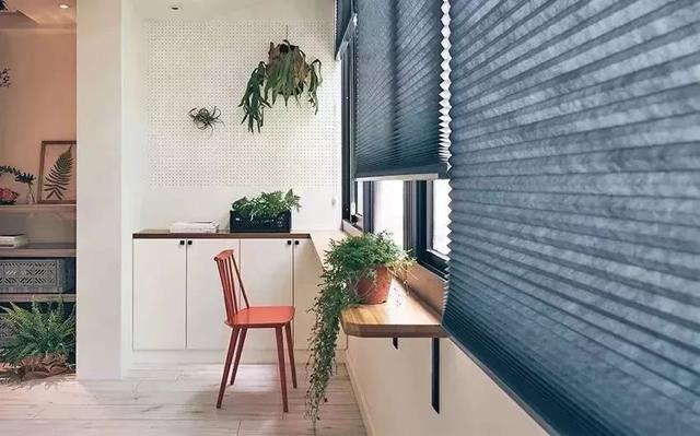 利用靠窗的位置來做了書房,柜子和長隔板的組合,用百葉簾作為窗簾,陽光被折疊之后,顯得更加的柔和、舒適。
