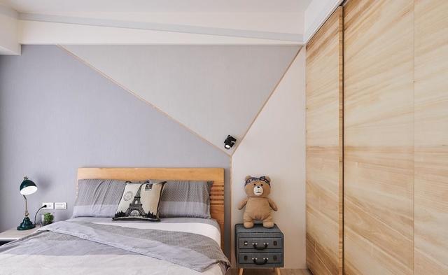這邊是次臥室的布置,簡單的幾何造型設(shè)計,另外還有木質(zhì)的材質(zhì)融入到整體空間的設(shè)計中,也是非常不錯的。