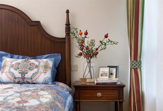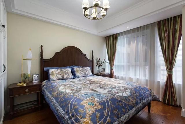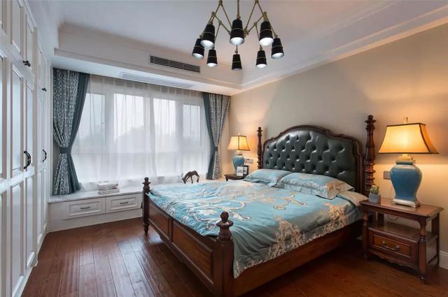 主臥,空間十分寬敞,床尾所對的墻面設置了收納功能強大的滿墻衣柜。青瓷對燈延續了客廳的風格,將臥室空間裝飾得柔和而舒適。