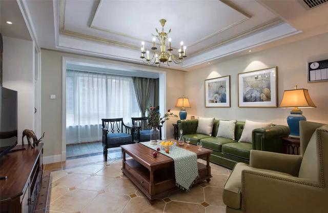 客廳,做了吊頂,以白色雙層木質頂線與銅制燭形頂燈的淺金色質感精致裝飾頂面。