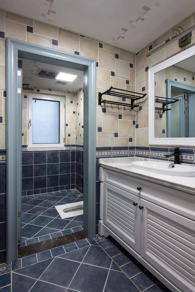 客衛,采用淺色與深藍仿古磚上下分色鋪貼裝修。干濕分離的設計便于日常使用,并延長木質柜體使用壽命。