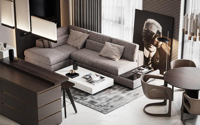 在灰色的織物沙發前面,擺著一張白色大理石的現代咖啡桌。這種奢華的材料設置了一個高檔的主題。沙發的設計結合了一個側桌到其基地,與黑色玻璃表面;這款不同尋常的、時尚的加長版堪稱高端。