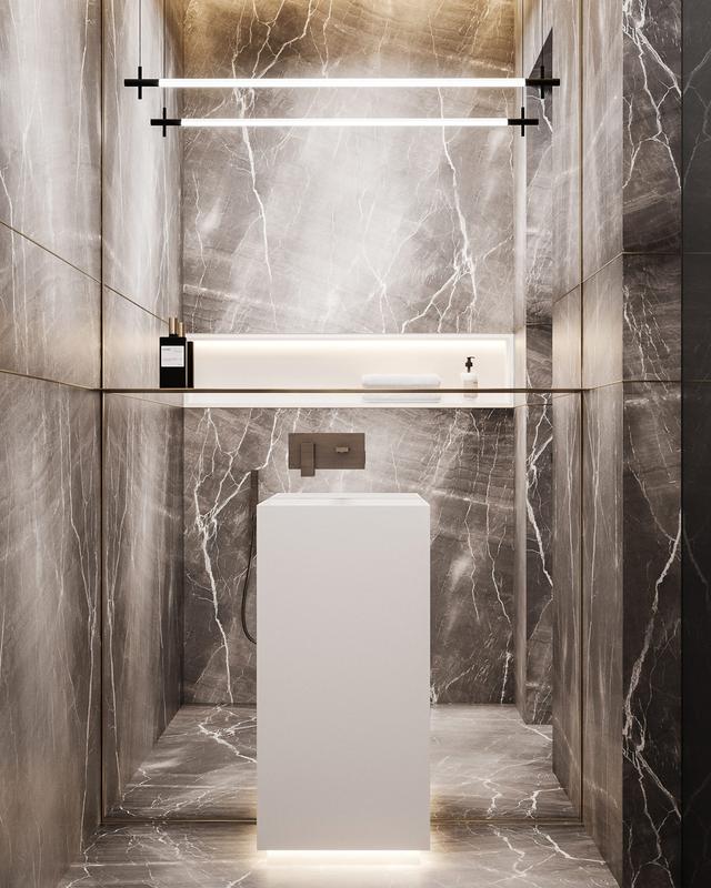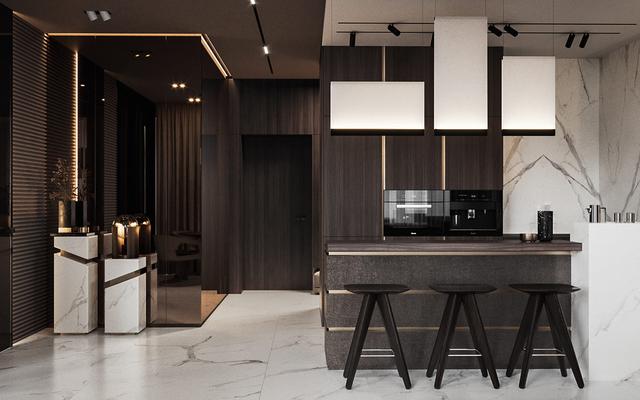 在廚房的盡頭有一面與書籍相配的大理石特色墻,這是一種奢侈而又容易清洗的選擇。休息區相鄰的面板采用肋狀設計,柔和的燈光使其更加突出。