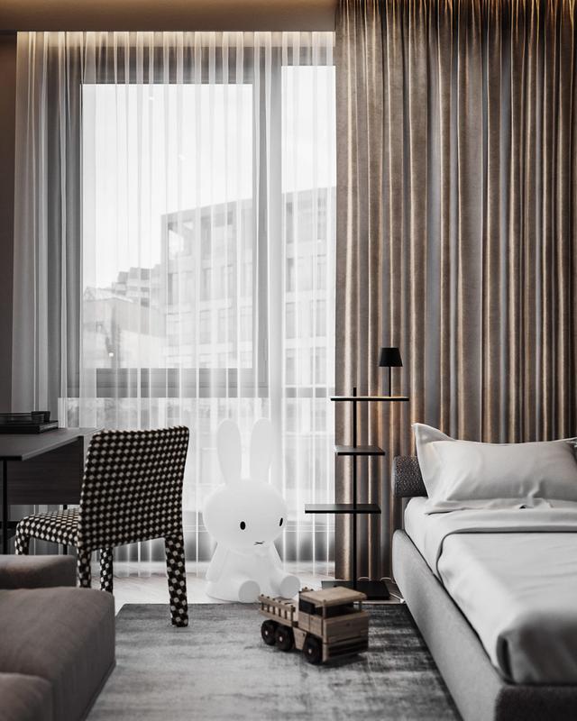 煙熏玻璃門將兒童臥室與客廳、餐廳組合分隔開來。安裝彩色玻璃門,而不是不透明的設計,讓生活空間感覺更大,因為這些門可以讓人瞥見下一個空間。玻璃也會反射光線,因此看起來非常光亮。孩子們的房間與主要的起居空間相鄰,形成了一個更寬敞的玩耍空間,因為孩子們可以在兩者之間自由移動。