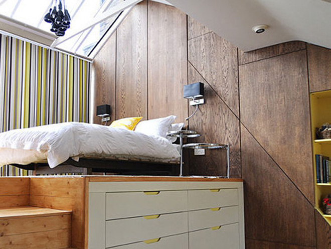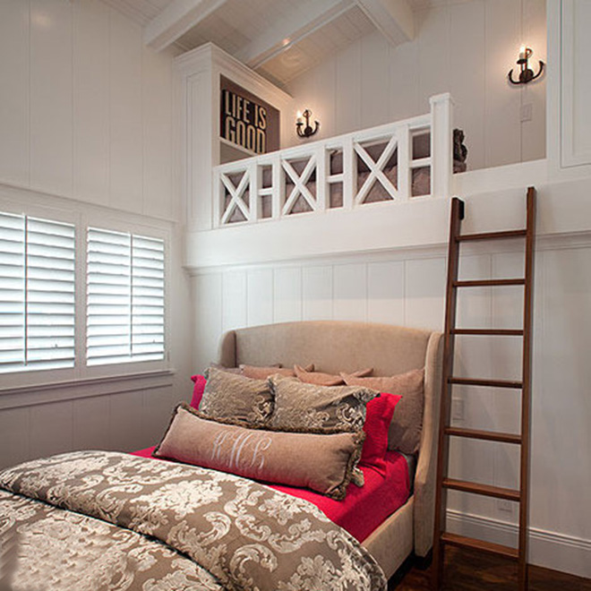 與其說是木臺打造的LOFT空間,還不如說這里是設在“衣柜上的臥室”。木臺上不僅有刻畫、有樓梯,其體內還有著大大小小的抽屜柜,很貼心地進行著大大小小的收納工作。不論你家的層高是高是低,只要調節好木臺的高度,就能擁有這樣的LOFT了!