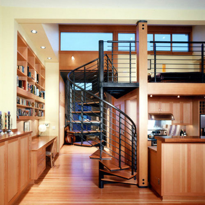 你是不是也愛沒有棱角的美麗?圓潤之美在螺旋樓梯上予以展現——圍繞著一根軸,樓梯旋轉而上,樓梯的扶手高聳并采用了鏤空設計,不僅節約空間、保證寬敞,在視覺上又兼顧了美觀。樓梯連接的上層作為臥室,下層則作為廚房,空間設計簡潔、別致。