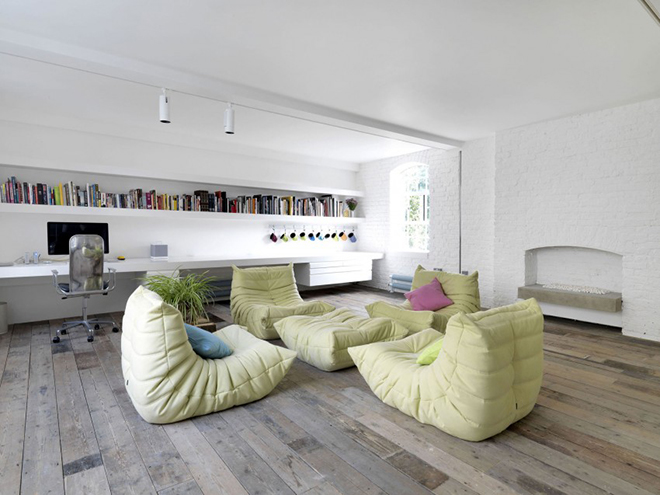 這個房間的層高不低,打造出的LOFT空間十分出色。一層空間則被設計成了簡約的工作角和會客區,白色的墻壁設計簡潔干凈,搭配上嫩綠色的沙發軟裝,清新的氣息就被打造出來了,同時,還弱化了空間過大帶來的空闊感。
