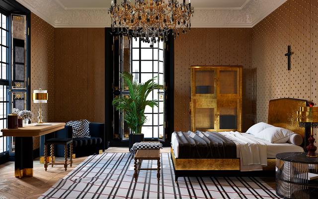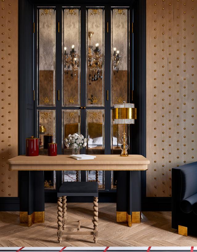 墻壁上的藝術是用金子畫的,桌子腿上涂著光澤,甚至連抽屜把手都受到了點石成金的感覺。