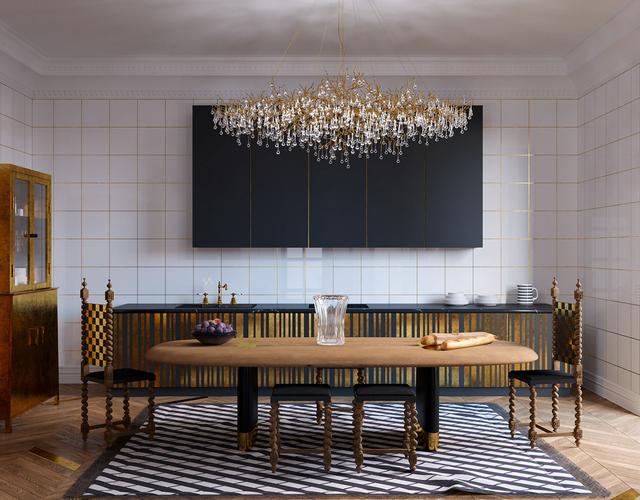 看起來適合國王和王后的餐椅放在廚房一張長餐桌的頭和腳上。餐桌上的金色餐椅占據了其余的空間,桌腿浸在金色里。一盞金色的枝形吊燈裝飾著餐廳。黑色的廚柜提供了一個黑暗的背景,使金色和水晶燈可以真正發光。