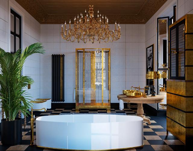 一個金色的淋浴間在一堵由白色和金色瓷磚砌成的墻的中央閃閃發光。一個黑色的垂直散熱器填補了一邊的空白,一個部分涂上了金屬。一套現代化的衛生間和浴盆內鑲有金色琺瑯,外面是白色的。馬桶水箱一直藏在墻壁里,只有一個金色的馬桶沖水板可以看出來。一個獨立的金色水龍頭充滿了別致的浴缸。