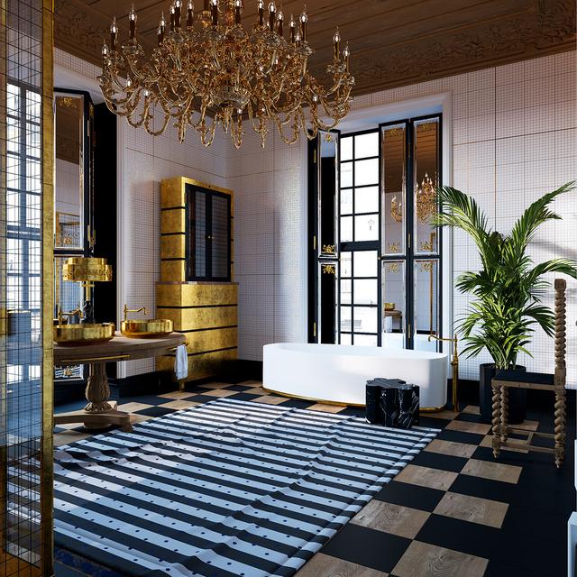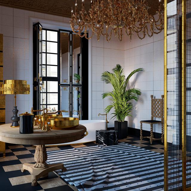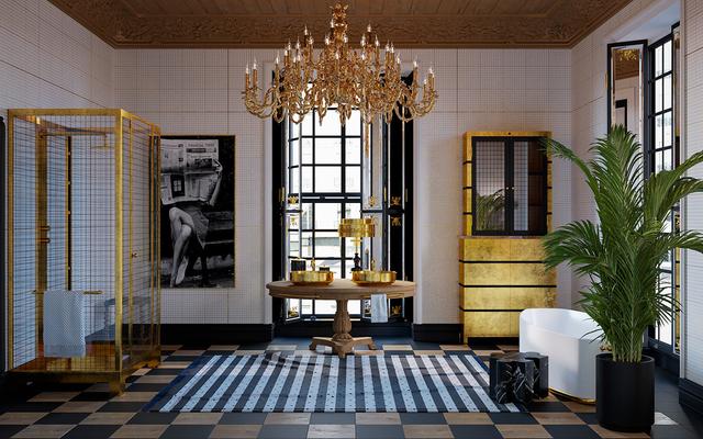 獨立的金色浴缸部分由高大茂盛的室內植物和黑色大理石邊桌遮擋。一個金色的梳妝臺——和放在廚房餐廳里的兩個梳妝臺很相似——放在浴室的一個角落里,用來存放新鮮的毛巾和一些洗漱用品。