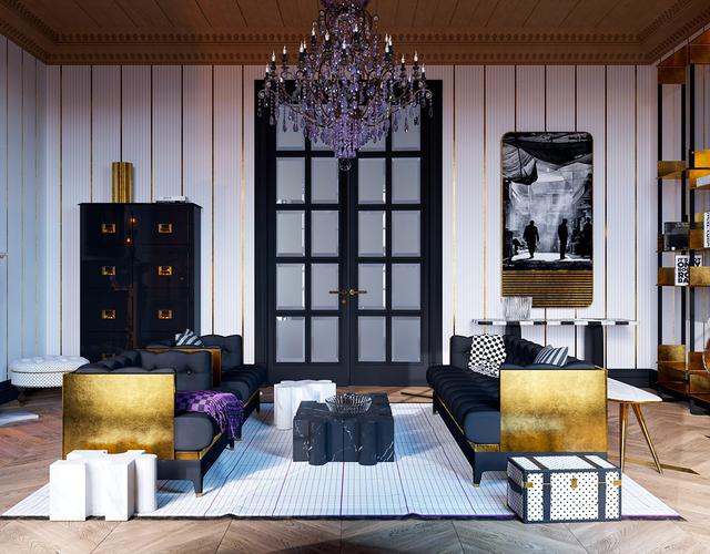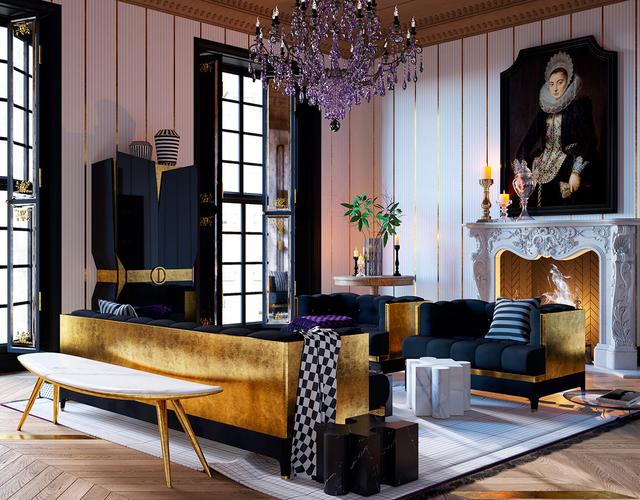 一對獨特的咖啡桌構成了一座黑白大理石島,中間是閃閃發光的金塊。閃閃發光的靠背椅和配套的扶手椅都是金色的裝飾。客廳的大衣櫥高高聳立在房間的后面,上面系著金色的腰帶。