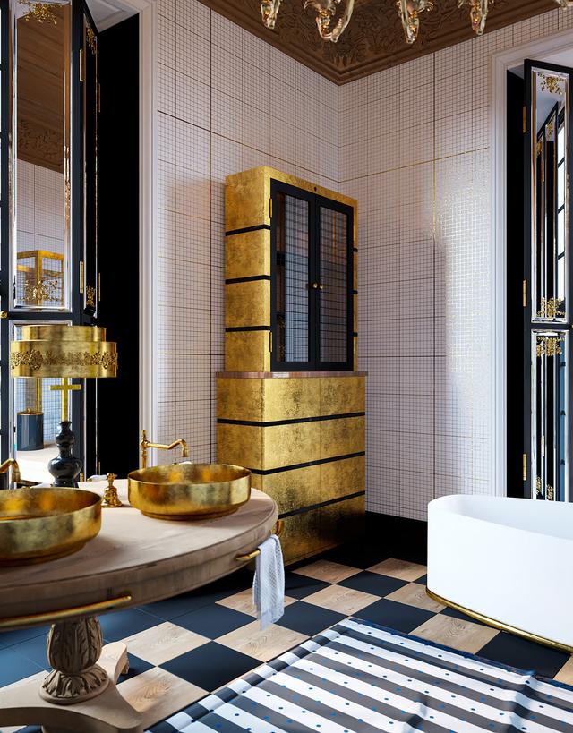 金色裝飾的豐富光澤觸及了這個住宅裝修設計的每一個角落。從閃閃發光的金色長椅和帝王扶手椅,到獨特的儲物柜和書架。耀眼的金屬主題甚至可以轉化為門鉸鏈、家具把手、小裝飾品和特別挑選的家居配飾的細微細節。在這個不同尋常的家居空間中,你會發現很多金色奢華的感覺,包括金色的客廳,金色的廚房,奢華的金色臥室,豪華的浴室,里面有一組引人注目的金色臉盆和配套的水龍頭。