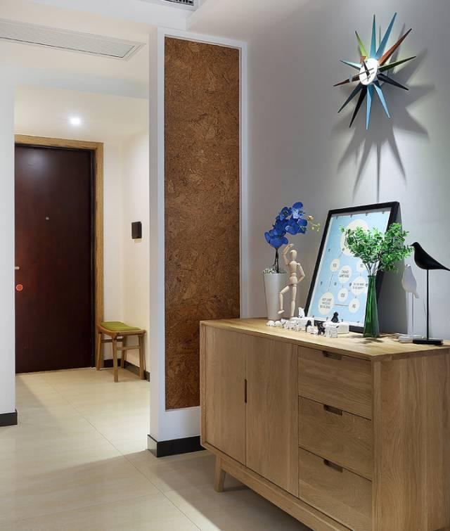 玄關處只擺放了一張換鞋凳,并無過多裝飾,綠色布藝凳面色彩清新,柔軟舒適。連接客廳的過渡地帶,設置了隔斷,簡易劃分了空能區域。