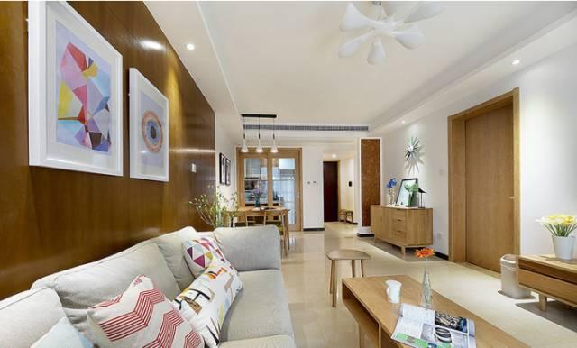 明顯可見,客廳原木風這一元素貫穿始終,通過色彩明暗深淺豐富視覺層次感。沙發背景墻顏色較深,掛上幾幅色彩清新亮麗的藝術畫來減輕壓抑質感,淺灰布藝沙發搭配淺色原木茶幾,營造出溫馨質樸的居室氛圍。