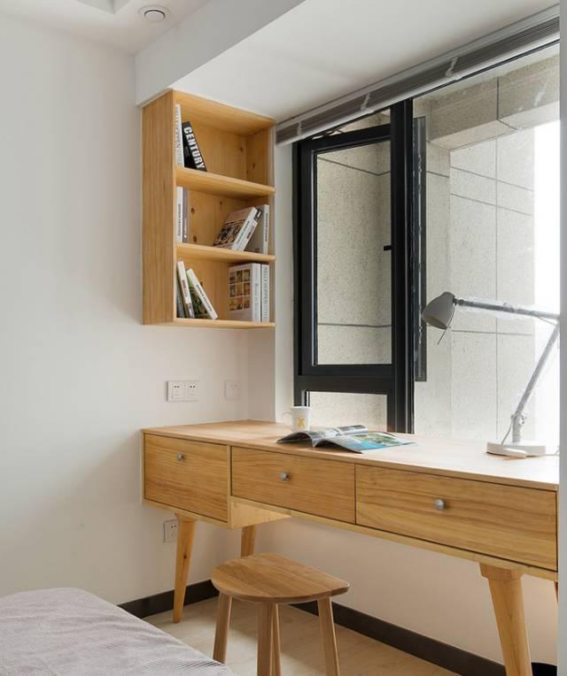 書桌所帶的各種型號的抽屜滿足不同的收納需求,壁櫥精巧可愛,擺上幾本主人愛看的書籍,實用極了。