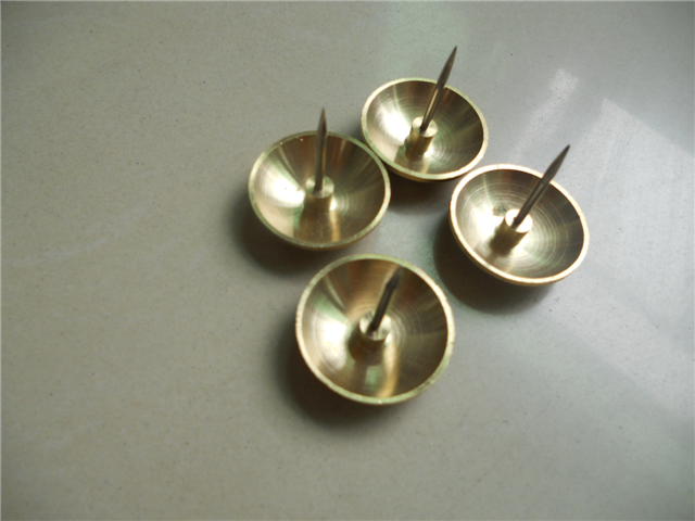 (底釘) 安裝在箱、包的底部,使箱、包底部免受磨損的零件。 家具銅飾件。泡釘因釘頭有一小圓形銅泡而得名,是固著銅飾件用的釘子。