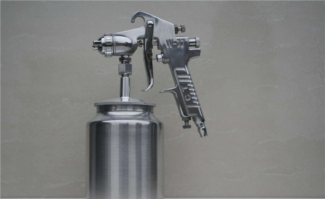 重力式手動噴漆槍:也被很多專業人士稱為上壺噴槍,主要是采用了重力法則讓油漆從上面盛裝的壺中快速的流到下面的噴嘴,再借用風的動力使其以霧化然后噴出。小面積的修補非這種方法莫屬,在使用的過程中我們可以通過提高油漆的承裝的勢能進行調節壓力;