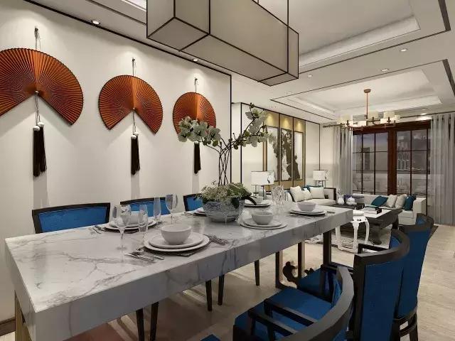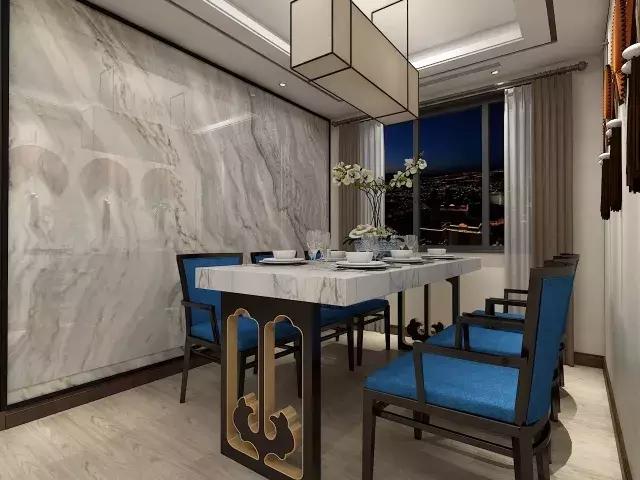餐廳同樣是采用冷色系的高端灰作為主色,餐桌的兩邊鏤空花雕花格外加金色的鑲邊,濃濃的古典奢侈,灰色的人造大理石的餐桌臺面與背景墻相呼應,是絕佳的搭配,藍色系的餐椅作為此空間的點睛之筆,顯得活潑起來;背景墻的折扇掛飾、天花黑鋼鑲嵌邊框、兩面背景墻的黑鋼收邊,賦予整個空間的高貴氣質,是淋漓盡致的元素搭配。