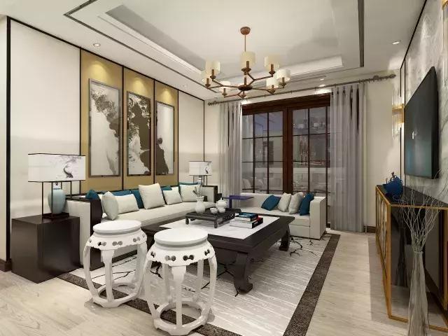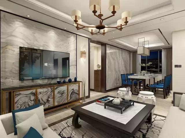 客廳地板采用冷色系的高端灰作為主色,金色邊框的電視柜和背景墻、大廳金色系的吊燈作為整個空間的過渡,彰顯高尚大氣,藍色和白色的布藝木沙發是整個空間的點綴,讓空間不失時尚,電視背景墻的灰色紋路大理石與地毯地板相呼應,讓整個空間協調起來,沙發兩邊角幾臺燈的水墨畫以及背景墻的水墨畫為客廳添加了寫意的中式元素。