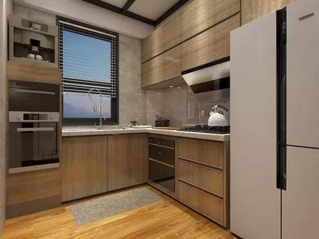 廚房地面采用木地板是個新穎以及大膽的設計,其玄機在于櫥柜的地面的鋪設了防滑磚,整個廚房的墻面和地面都做了防水防潮防霉的界面處理;木紋飾面的晶鋼櫥柜與木地板的顏色深淺漸變相呼應,黃金臺面操作功能區,洗、切、煮,空間得到充分的使用,精致的廚房設計讓客戶使用起來得心應手。