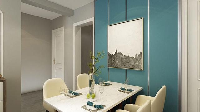 餐廳的裝修墻壁用的是藍色,搭配的是抽象的黑白色壁畫,可以更好的進行餐廳背景墻的裝飾美化,搭配擺放的是大理石臺面的餐桌和米色的餐椅,這樣的餐廳裝修方式也是十分的簡約時尚,可以讓餐廳裝的很大氣。