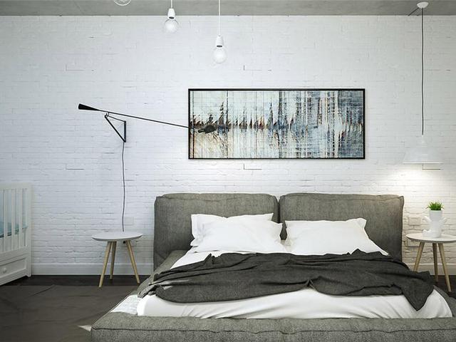打造了開放式廚房,這樣能夠大大提升室內的空間感,墻壁上還是采用白色的復古格調,搭配深色的實木地板,使得臥室顯得非常時尚有檔次感,寬敞的大床居中擺放,兩邊各有一個精致的小茶幾,室內沒有多余的裝飾,顯得非常簡單大方。
