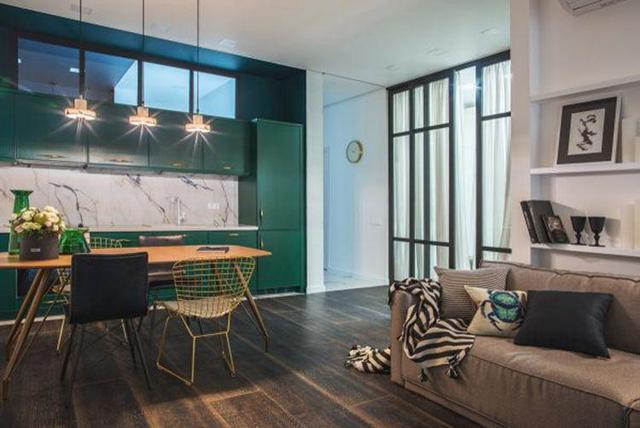 客廳和廚房在同一區域,且沒有做任何的隔斷,屋內的整體構造簡約而又充滿了藝術氣息,墨綠色的櫥柜搭配深灰色的地板,給人一種深邃質感,但是屋內的燈光光源和擺件都起到了很好的烘托效果,并不感到冷冰。