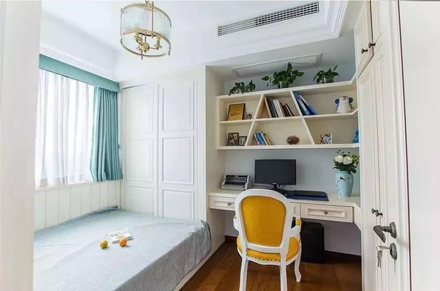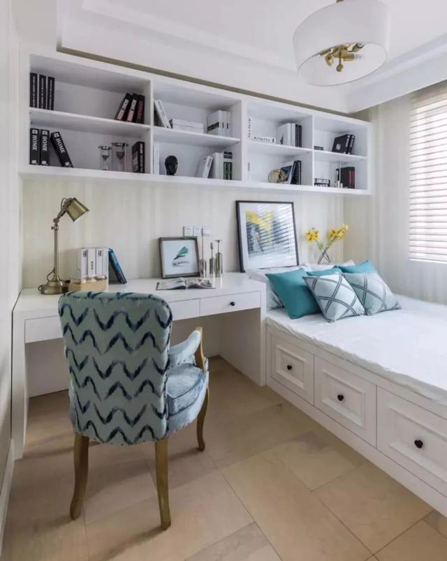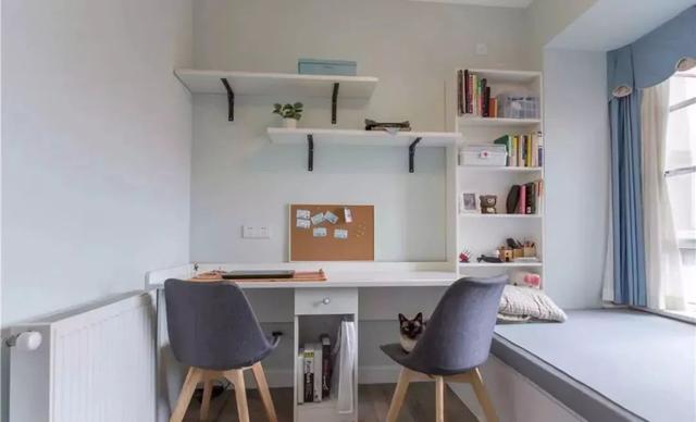 也可以在這個書桌前方的墻面裝上擱板,擺上清新綠植、書籍或精致的飾品,也是很精致舒適。