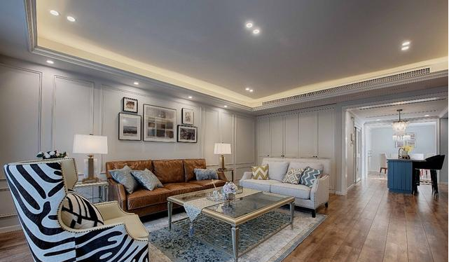燈帶的顏色把溫馨的氛圍烘托的更加精致。地面的木地板和沙發的皮色很協調。高低柜的應用也是經典的美式裝修搭配造型。窗簾專門選的單色有一點金色花紋的,和整體的氛圍搭配,帶和紗簾一起,會很典雅精致!沙發背景墻走的石膏線和墻壁是一個整體的灰金色色調,溫暖。別人來家里參觀做客,會顯得很有面子。
