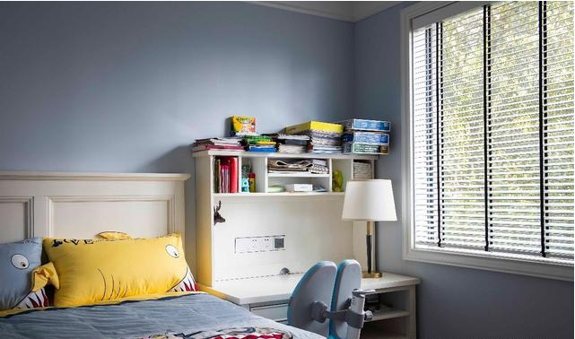 兒童房因為小主人是男生,所以給他涂了適合男孩子的灰藍色墻。這個空間是要把學習和娛樂融為一體的。沒入境的飛機形狀的掛鐘非常帥氣。窗戶好包了邊,會很高級。