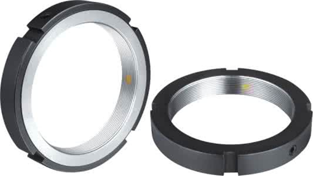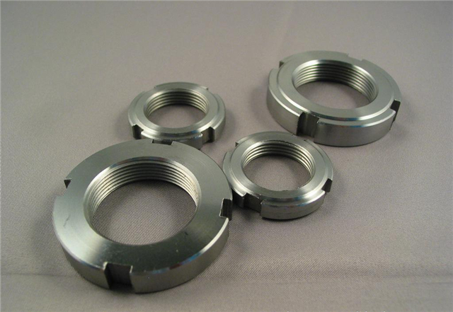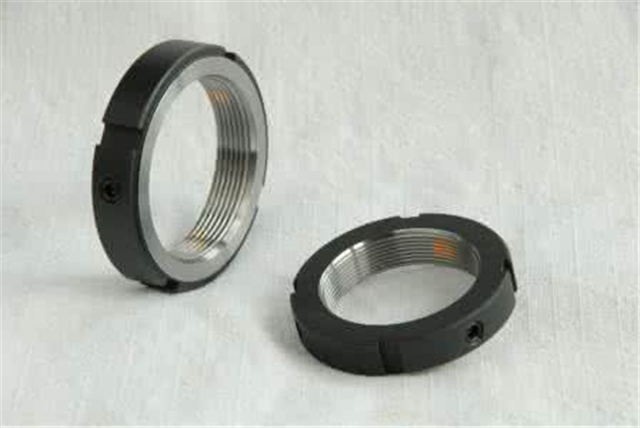第二種是專用的防松螺母,需要和一種可以防松墊片一起使用。專用的防松螺母不是六角螺母,而是一中圓螺母,在螺母的圓周上開有3個、4個、6個或者8個缺口(視螺母大小和生產廠家產品系列不同而異),這幾個缺口既是擰緊工具的著力點,又是防松墊片卡口的卡入處。